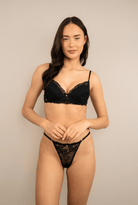 The Muse g-string is made of soft elastic lace, has a cotton crotch and is finished with gold-tone hardware. Pair the Muse g-string with our muse bra for a beautiful set!